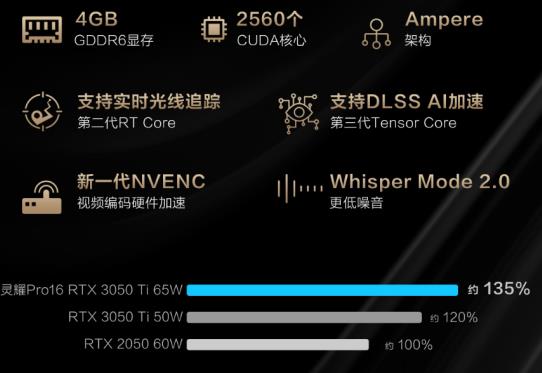 顯卡方面,靈耀Pro16 2022搭載Nvidia GeForce RTX 3050Ti光追獨顯。全新Ampere架構(gòu),擁有2560個CUDA核心以及4GB GDDR6顯存。在DLSS AI加速和Dynamic Boost2.0顯卡智能動態(tài)增強技術(shù)的參與下,功耗可提升至65W,較RTX 2050提升74%的性能,讓這塊RTX 3050Ti成為一塊真正的“性能猛獸”,能夠輕松處理各種創(chuàng)作素材和動畫渲染。