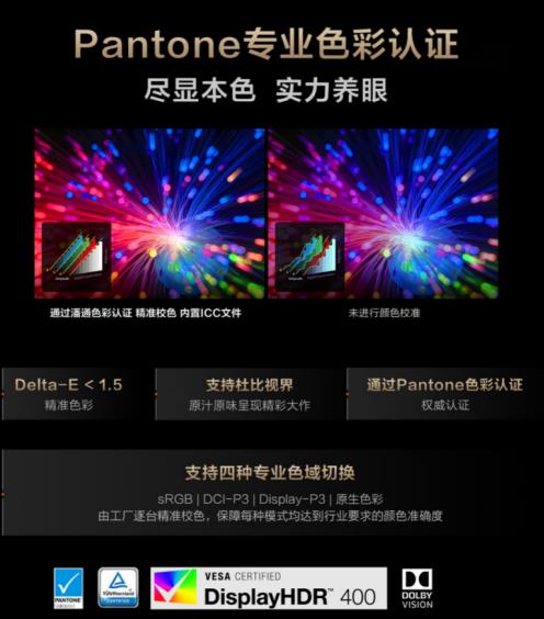 靈耀Pro16 2022的這塊擁有100% DCI-P3影院級廣色域的屏幕還內(nèi)置了定制ICC文件(平均Delta E<1.5),擁有Pantone色彩認證、VESA DisplayHDR True Black 400認證,讓屏幕中所呈現(xiàn)的內(nèi)容更貼近真實,也為HDR視頻觀影和內(nèi)容創(chuàng)作奠定了良好基礎(chǔ)。