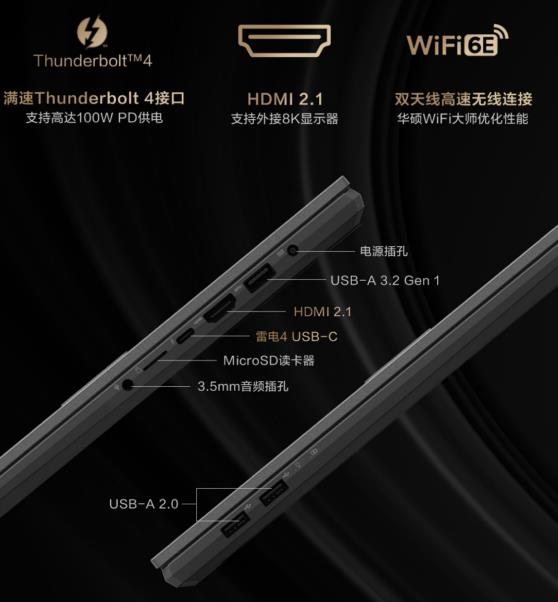 靈耀Pro16 2022配備有雷電4 Type-C等多種常用接口,拓展性全面,全接口的設(shè)計保證了創(chuàng)作者多端設(shè)備協(xié)作的需求。其中功能最為強大的雷電4接口具有高達40Gbps的傳輸速度,能夠外接高性能顯卡塢、高速SSD、8K顯示器等,滿足各類擴展需求。