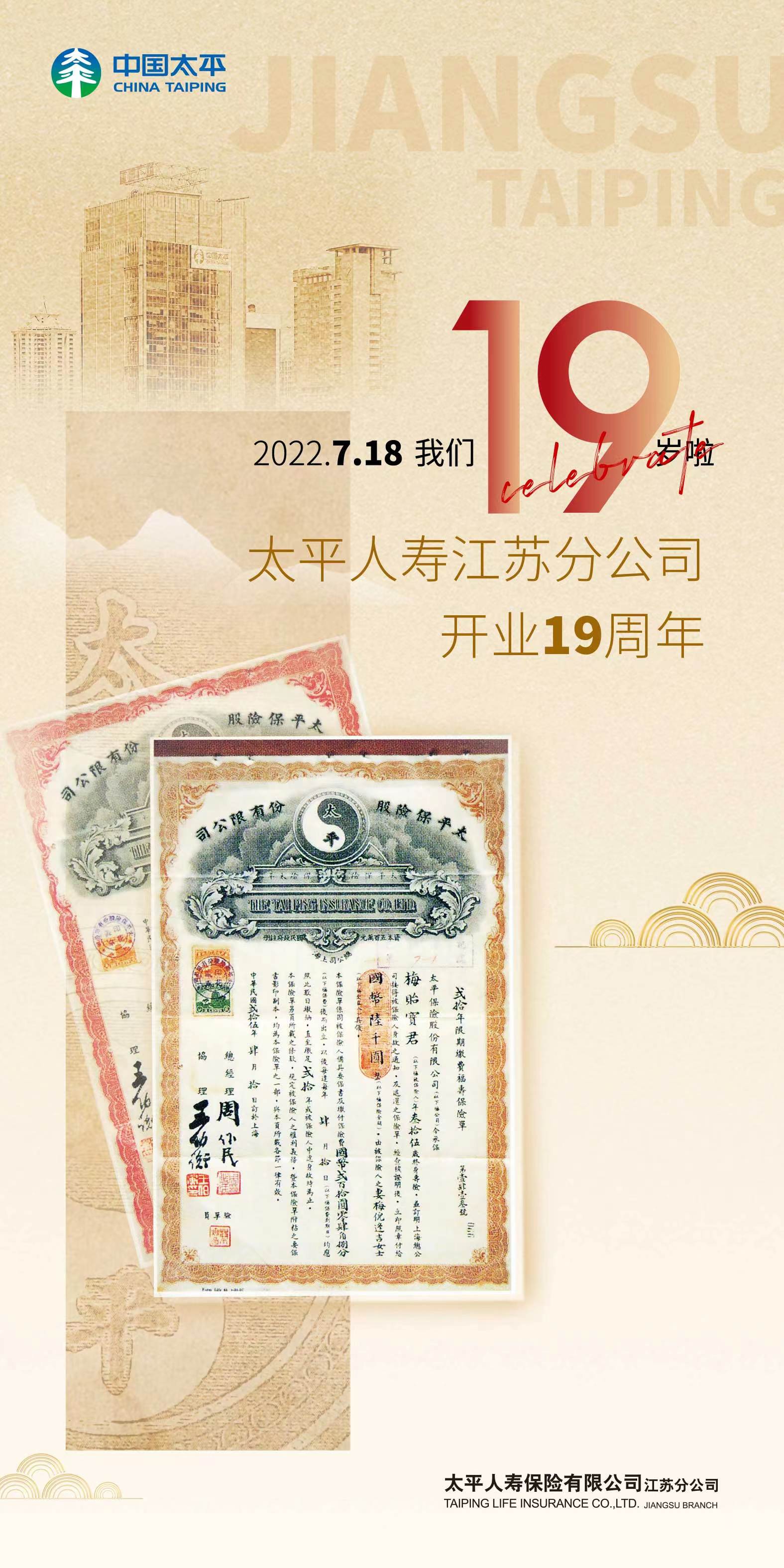 19年前傳奇民族保險(xiǎn)品牌太平人壽復(fù)業(yè)金陵,如今江蘇分公司迎來了自己第十九個(gè)生日。2022年7月18日,太平人壽江蘇分公司舉辦品牌文化宣傳日暨開業(yè)十九周年司慶日活動(dòng)。